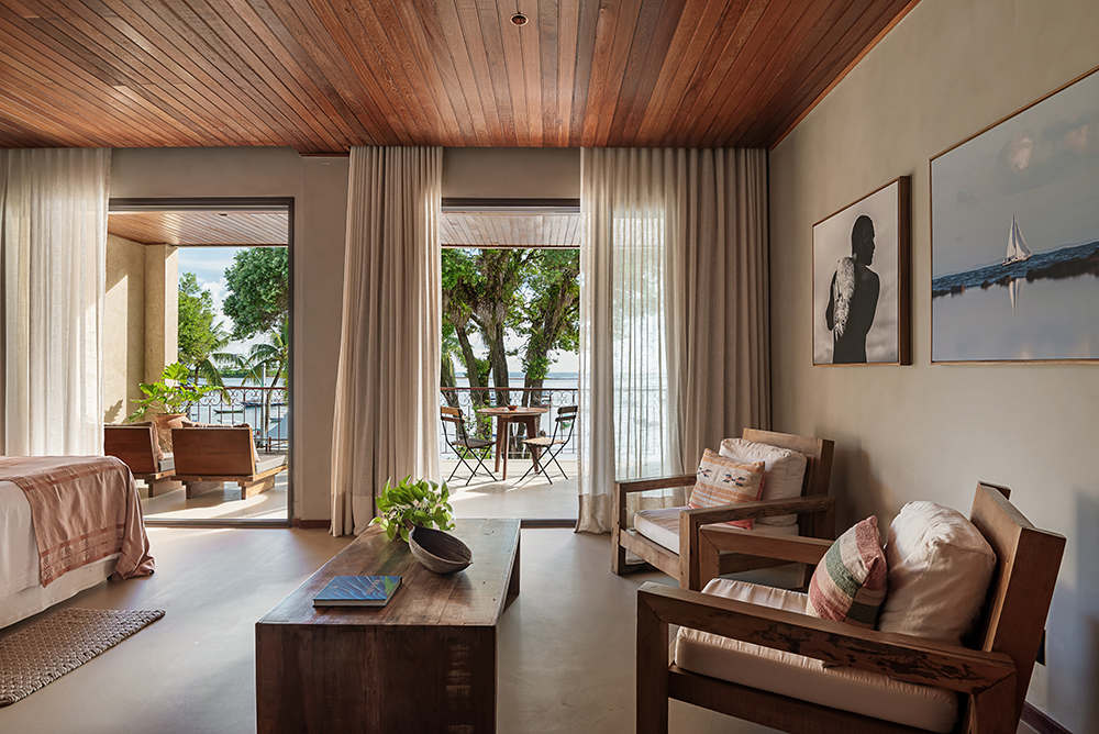 Localizada no piso superior, esta suíte tem 80m2 e é a mais ampla do Hotel. A varanda espaçosa oferece vista para a Orla dos Pescadores. Esta é uma acomodação especial para um casal e também ideal para quem viaja em família, pois pode acomodar mais 2 pessoas em uma suíte menor localizada em seu interior.